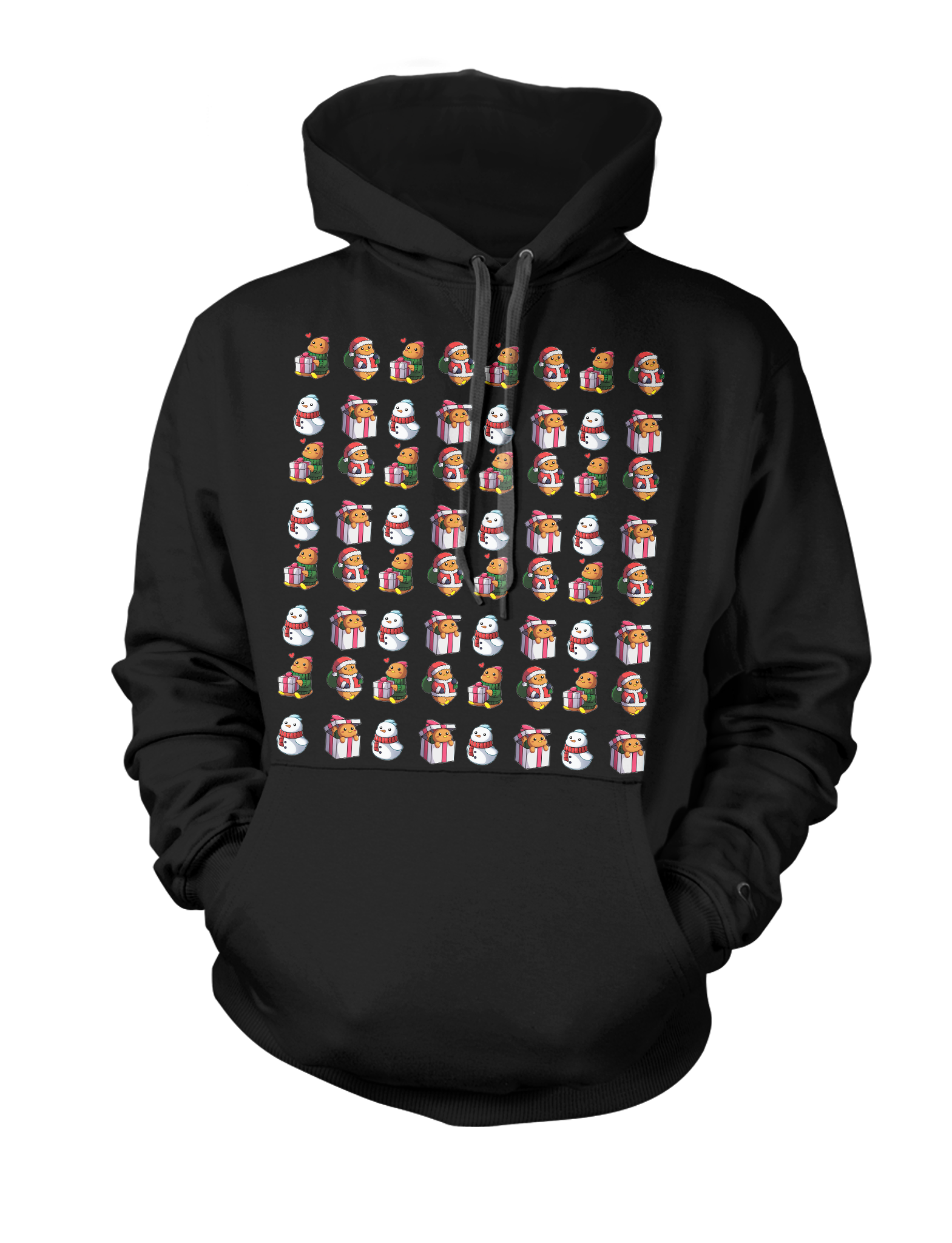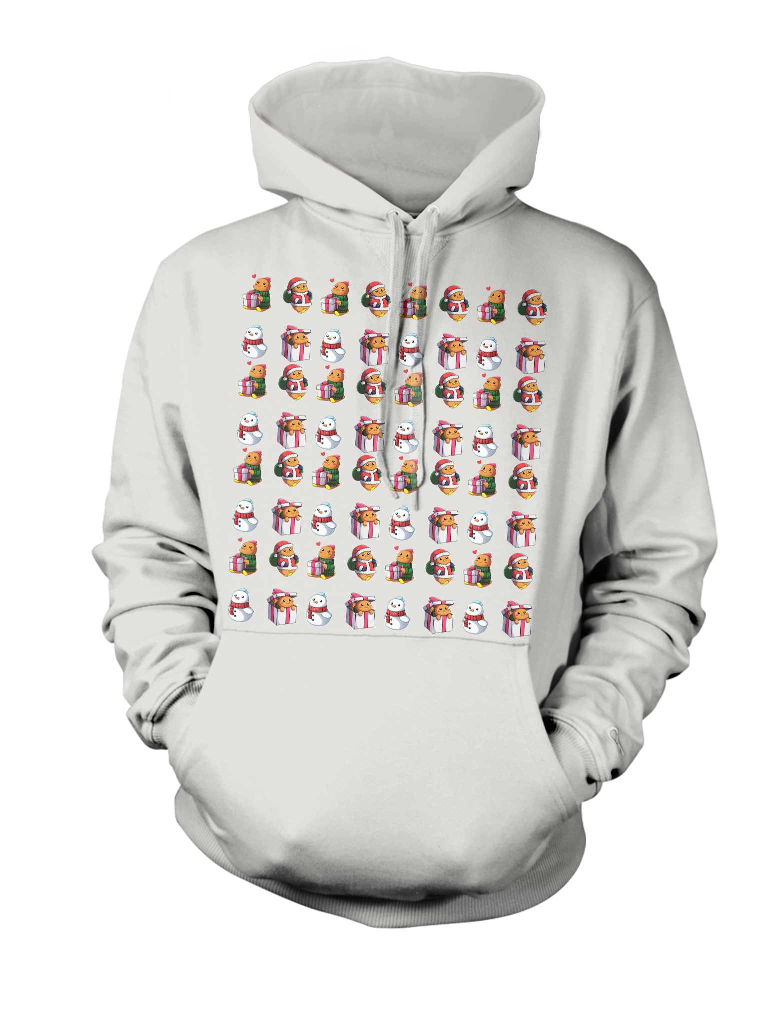 Flex your Christmas creative muscles with this collection of cute and apathetic cozy chickens. Be the envy of your relatives, family, friends and side piece. All chickens pictured on this hoodie are 100% guaranteed to have received grief counselling upon losing their gift.