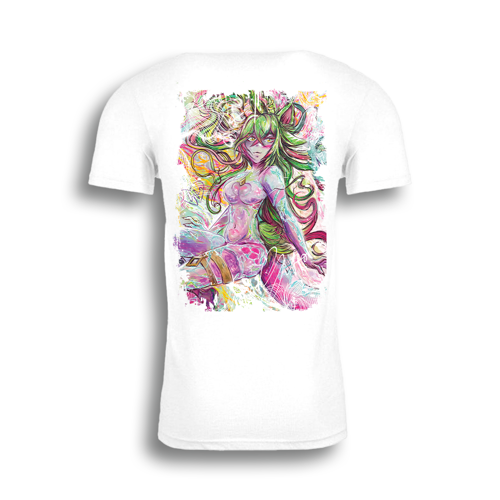 This t-shirt features a stunning print of Suto's VTuber model as a traditional painting, brought to life with vibrant details and a luminous design. Inspired by Hextech and Arcane aesthetics, it showcases glowing magical elements and crystalline highlights. Suto’s hybrid cat-axolotl features, including her four cat ears, tail, and elegant horns are beautifully rendered with an ethereal backdrop enhancing the captivating artistry.